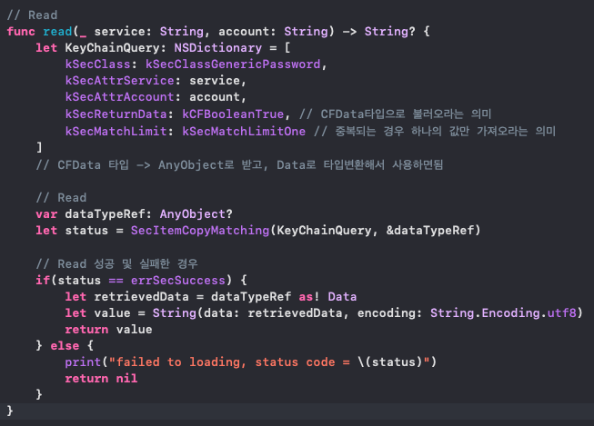 kSecReturnData: kCFBooleanTrue, // CFData타입으로 불러오라는 의미