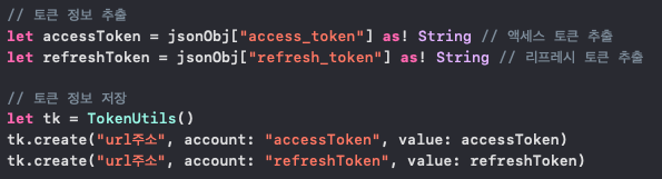 로그인 성공시 서버로 부터 받은 json객체에서 토큰 정보 가져와 key chain에 저장