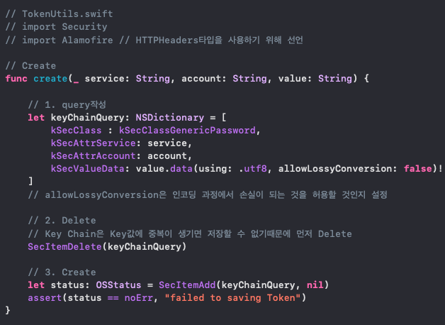 - Key Chain Query는 "CFDictionary"타입이지만, 이를 상속받은 NSDictionary나 NSMutableDictionary사용
