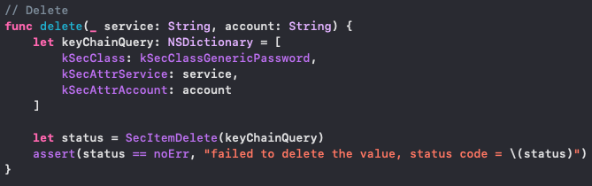 assert(status == noErr, "failed to delete the value, status code = \(status)")