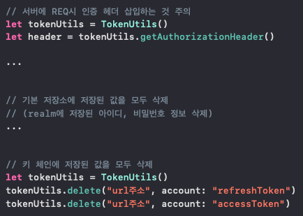 - 클라이언트의 key chain에 인증된 인증 토큰 삭제(access token과 refresh token)