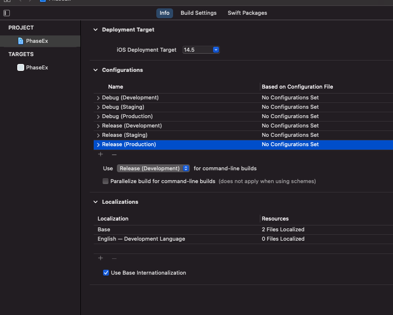 - Configuration 파일이 target에만 설정된 화면: project에도 설정되어야 활성화