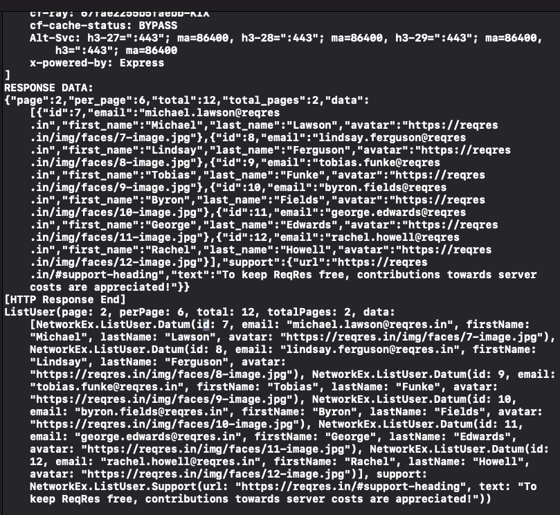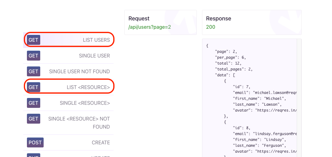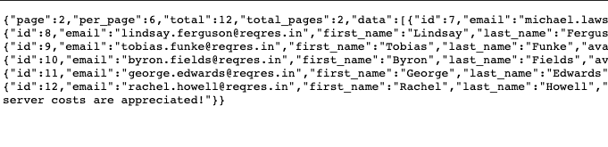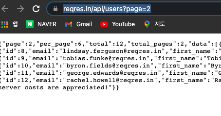 - 위 링크 클릭, 복사: https://reqres.in/api/users?page=2