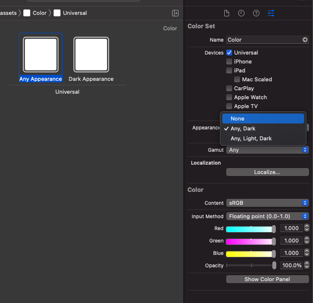 - Any Appearance나 Dark Appearance 클릭 > 오른쪽에 Color Set 창 확인