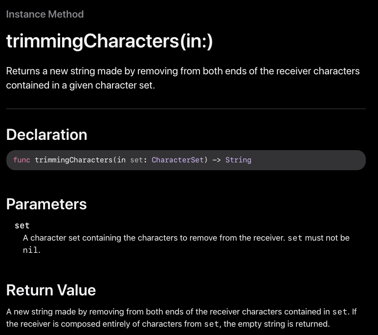 - trimmingCharacters(in:): 문자열의 왼쪽, 오른쪽 끝에있는 character를 삭제하는 인스턴스 메소드