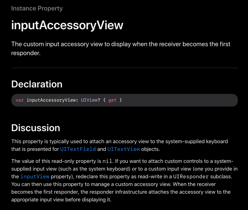 - inputAccessoryView: https://developer.apple.com/documentation/uikit/uiresponder/1621119-inputaccessoryview