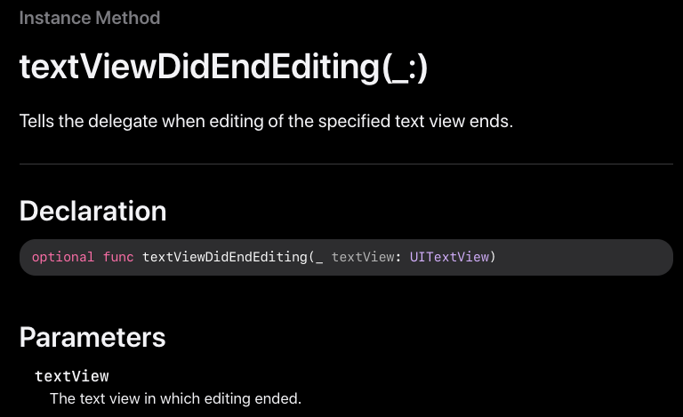 - textViewDidEndEditing(_ textView: UITextView): https://developer.apple.com/documentation/uikit/uitextviewdelegate/1618628-textviewdidendediting