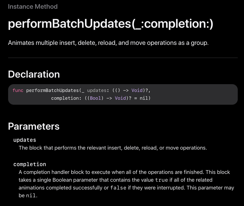 - perforomBatchUpdates()의 클로저 블록에 사용하는 것도 beginUpdates()와 endUpdates() 동일
