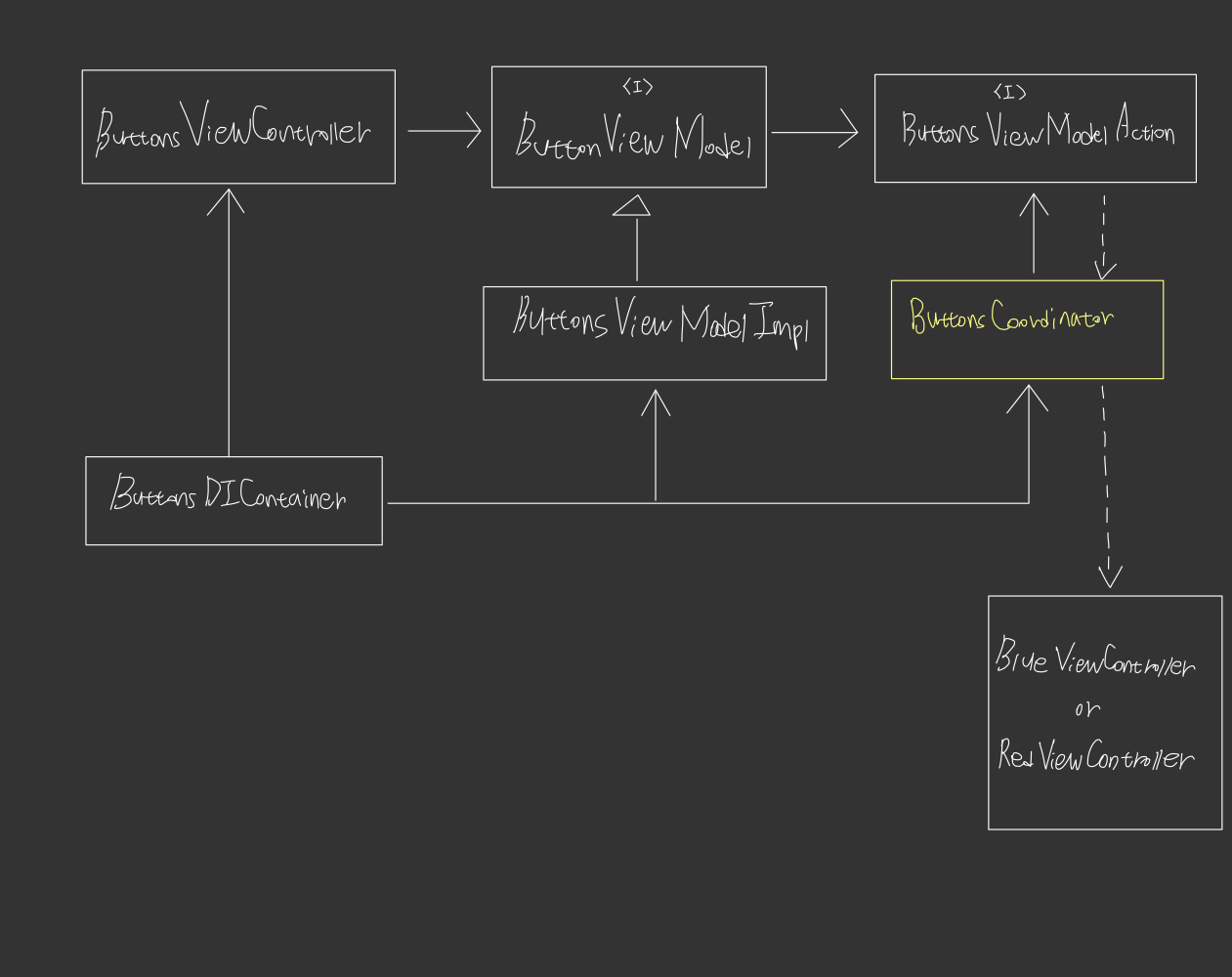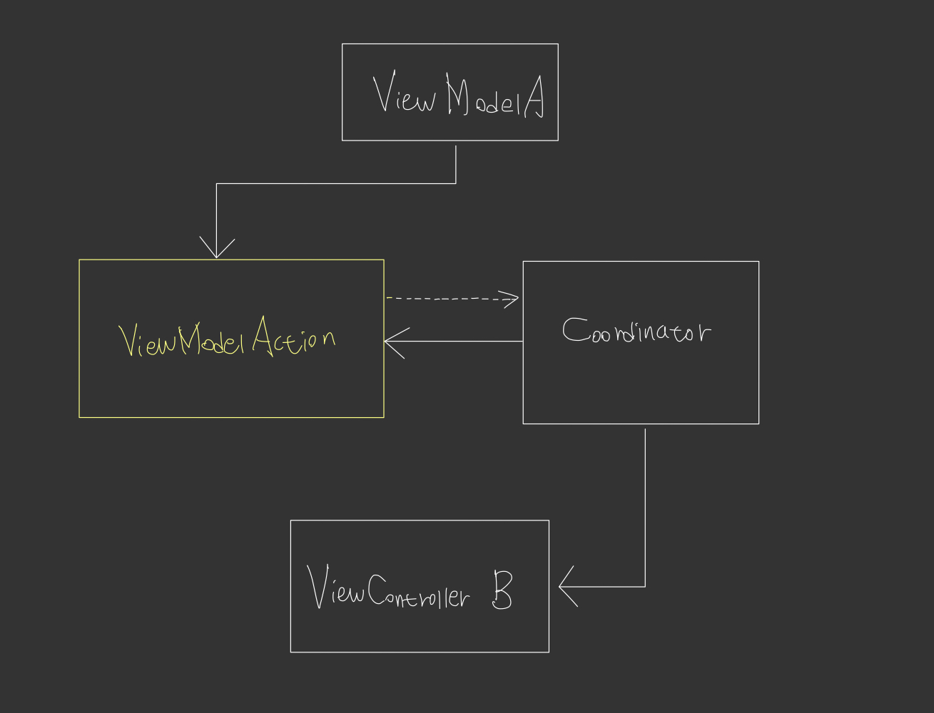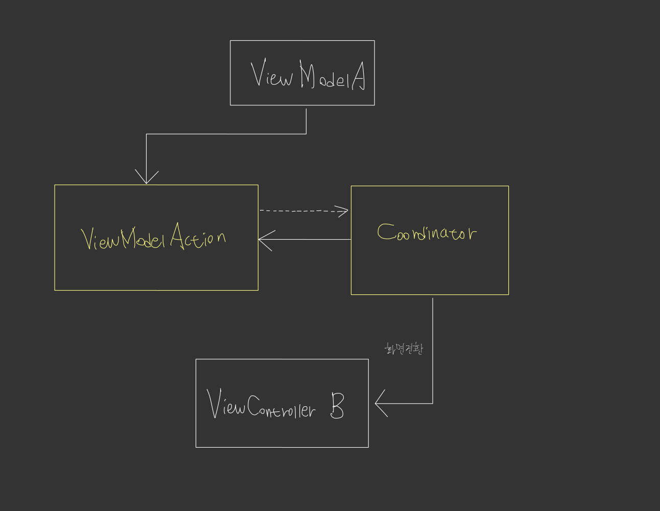 - ViewModel에서 dependencies로 가지고 있는 ViewModelAction을 통해 화면전화하는데, ViewModelAction은 Coordinator에서 구현하여 주입하는 형태