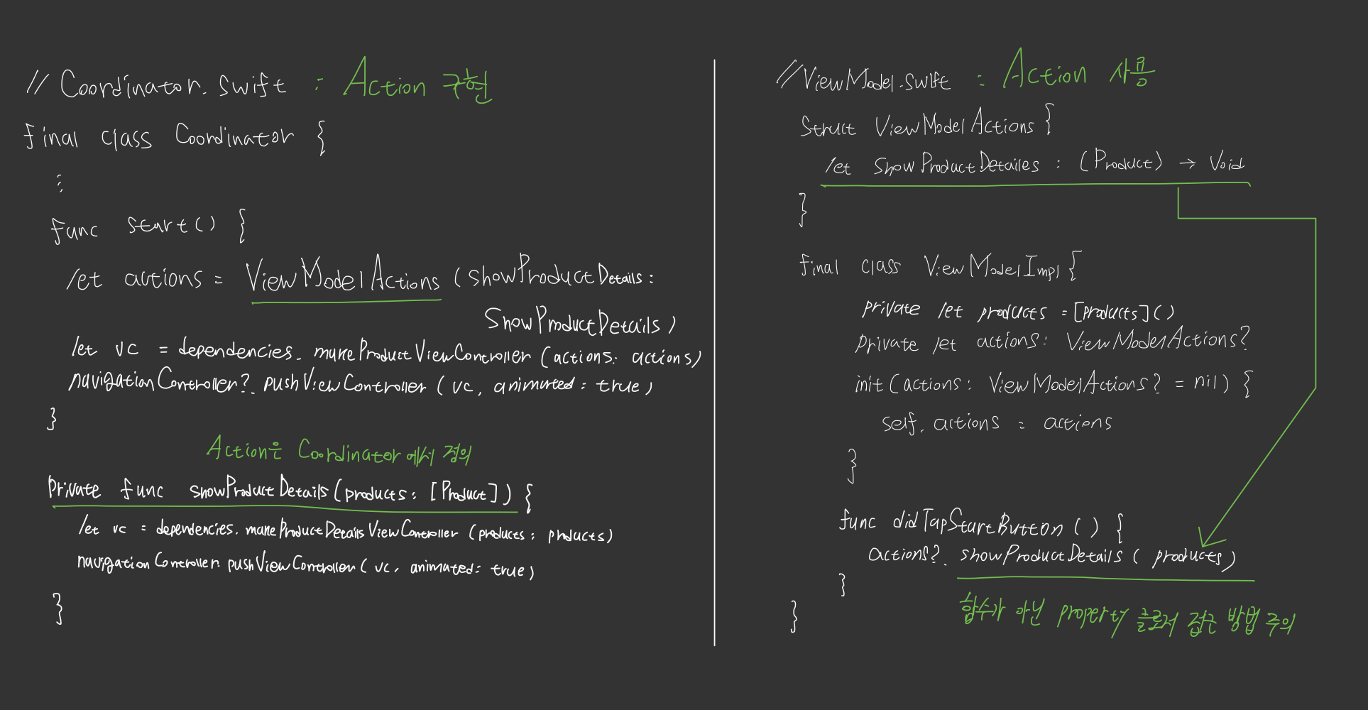 - Action은 ViewModel이 가지고 있다가 Coordinator를 호출할 때 사용