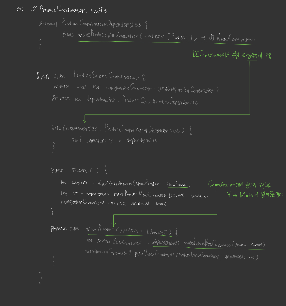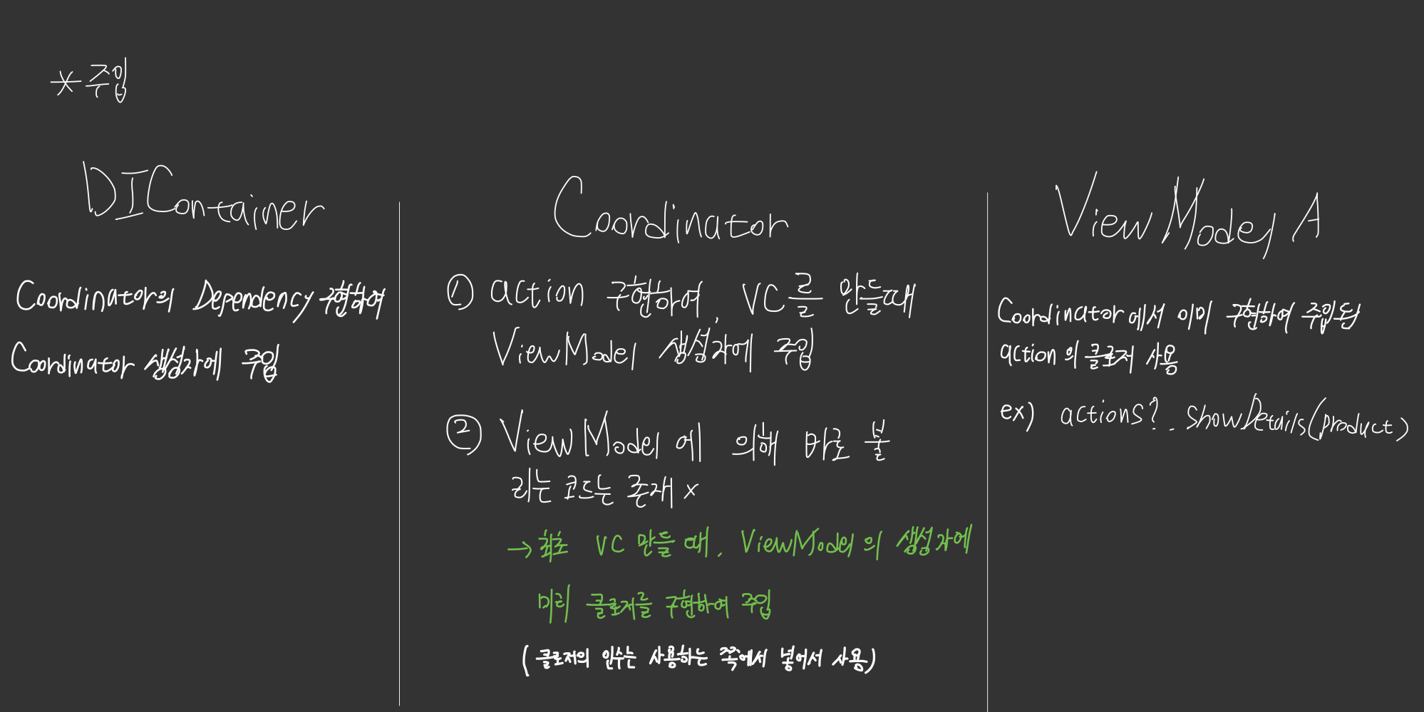 - 화면전환시 필요한 ViewController 생성은 DIContainer에서 정의, ViewModel의 Action에 따라 화면 전환 로직은 Coordinator에서 정의, Action은 ViewModel에서 호출