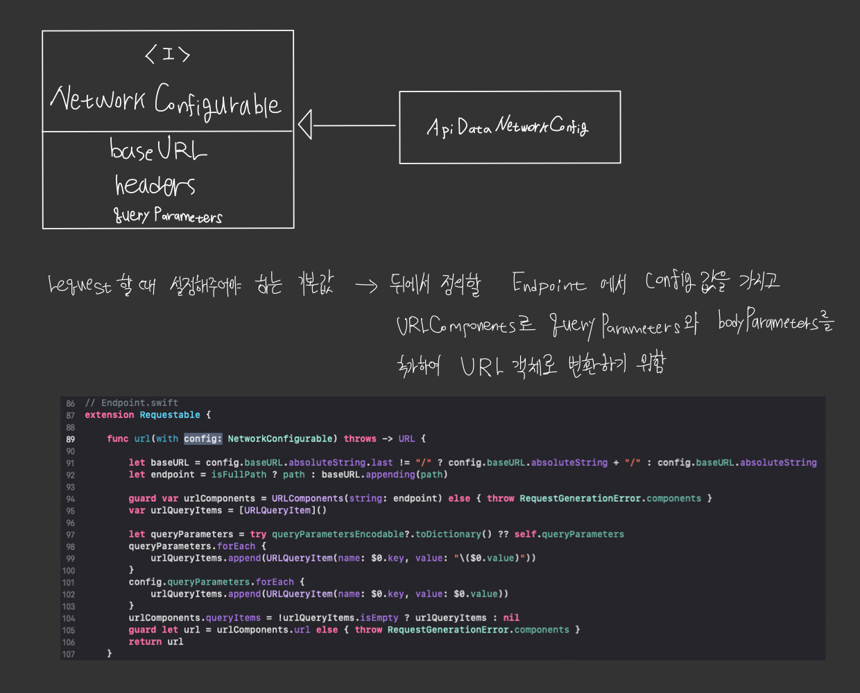 - requestURL은 URLComponent를 이용하여 baseURL과 path, query정보를 합한 완성된 URI를 통해 Request객체를 만들고, 이 Request 객체 생성