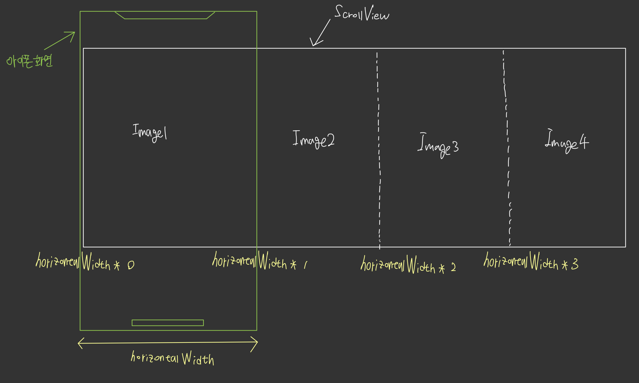 - imageView를 scrollView에 추가할 때 xOffset값을 horizontalWidth값에 비례하여 삽입 후, scrollView의 contentSize.width값을 horizontalWidth * imageViews.count만큼 설정하면 완료