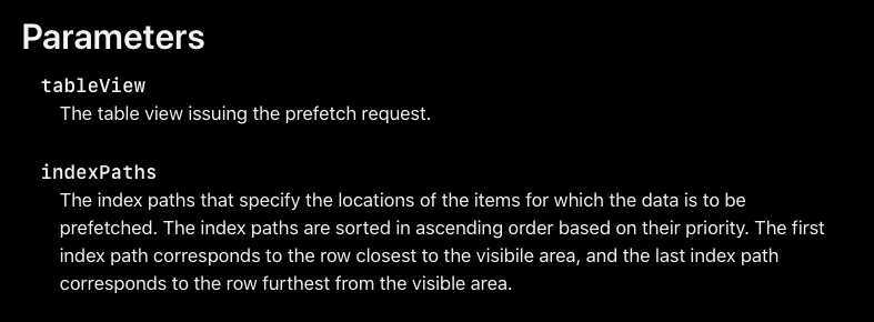 - tableView(_:prefetchRowsAt:): https://developer.apple.com/documentation/uikit/uitableviewdatasourceprefetching/1771764-tableview