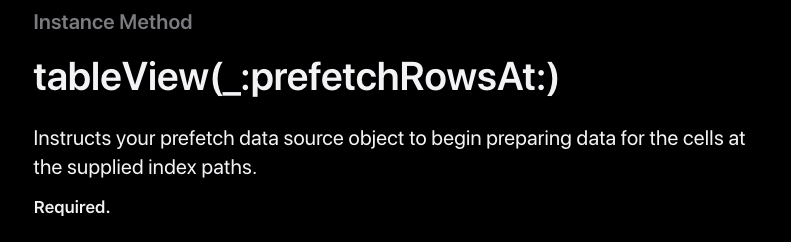 - tableView(_:prefetchRowsAt:): https://developer.apple.com/documentation/uikit/uitableviewdatasourceprefetching/1771764-tableview