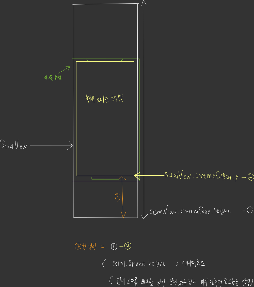 - 주의: 단, scrollViewDidScroll에서 여러번 호출될수 있으므로, API를 호출하기 전에 flag값을 놓고, api가 호출이 끝난 경우만 동작하도록 설정 필요