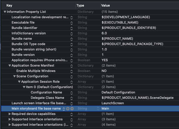 2. plist.info -> "Application Scene Manifest" 내부 항목의 "Storyboard Name"제거