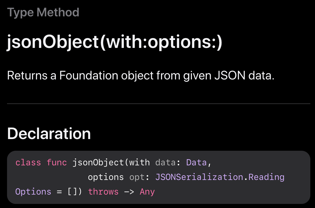 - jsonObject(with:options:): https://developer.apple.com/documentation/foundation/jsonserialization/1415493-jsonobject