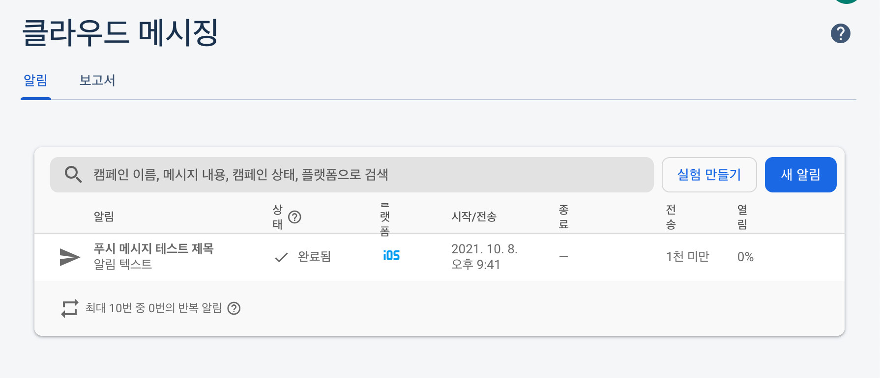- Firebase 콘솔 > 설정 > 클라우드 메시징 탭 > Send Your first message 클릭