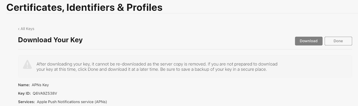 - 다운로드를 누르면 .p8 형식의 푸시 인증서 키 확인