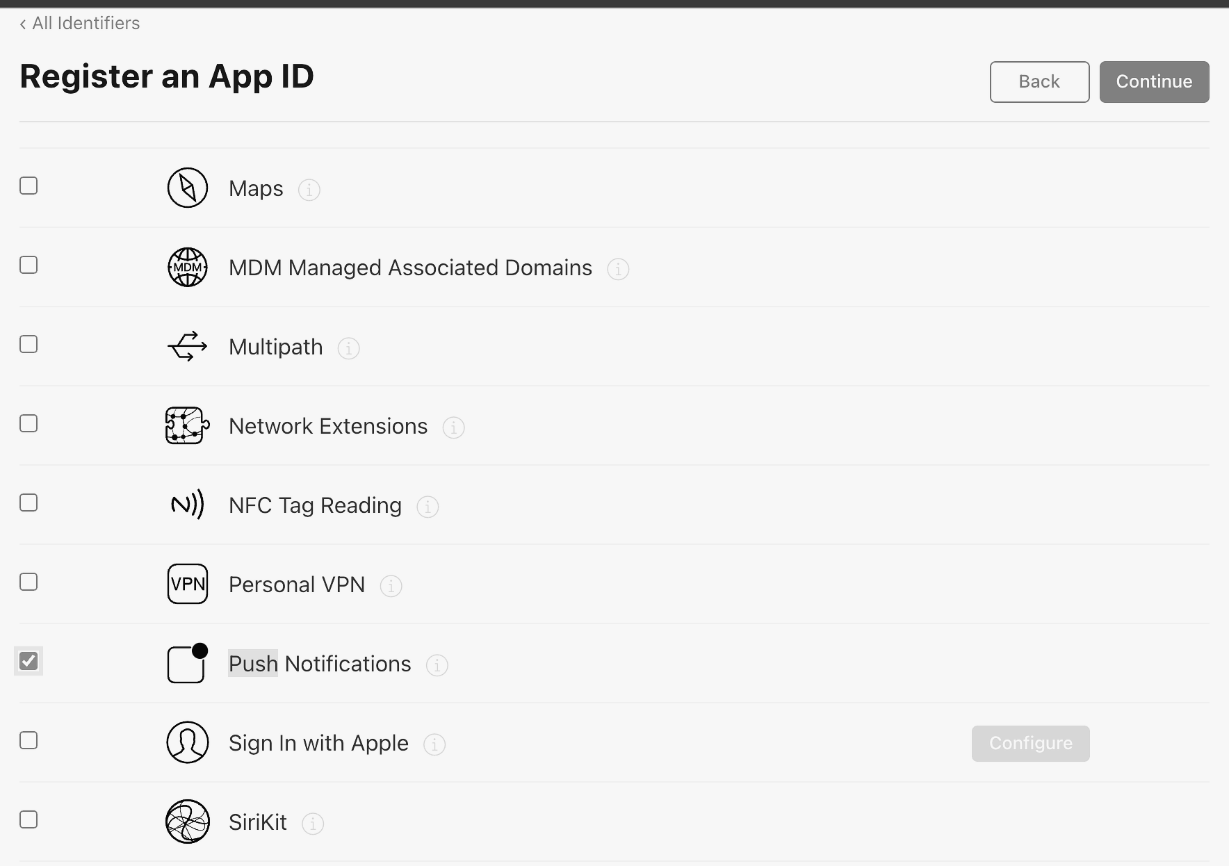- .p8이 없이 Push 설정하려면 Apple Developer 사이트에서 App Identifiers에 Certificate를 따로 등록해야 가능