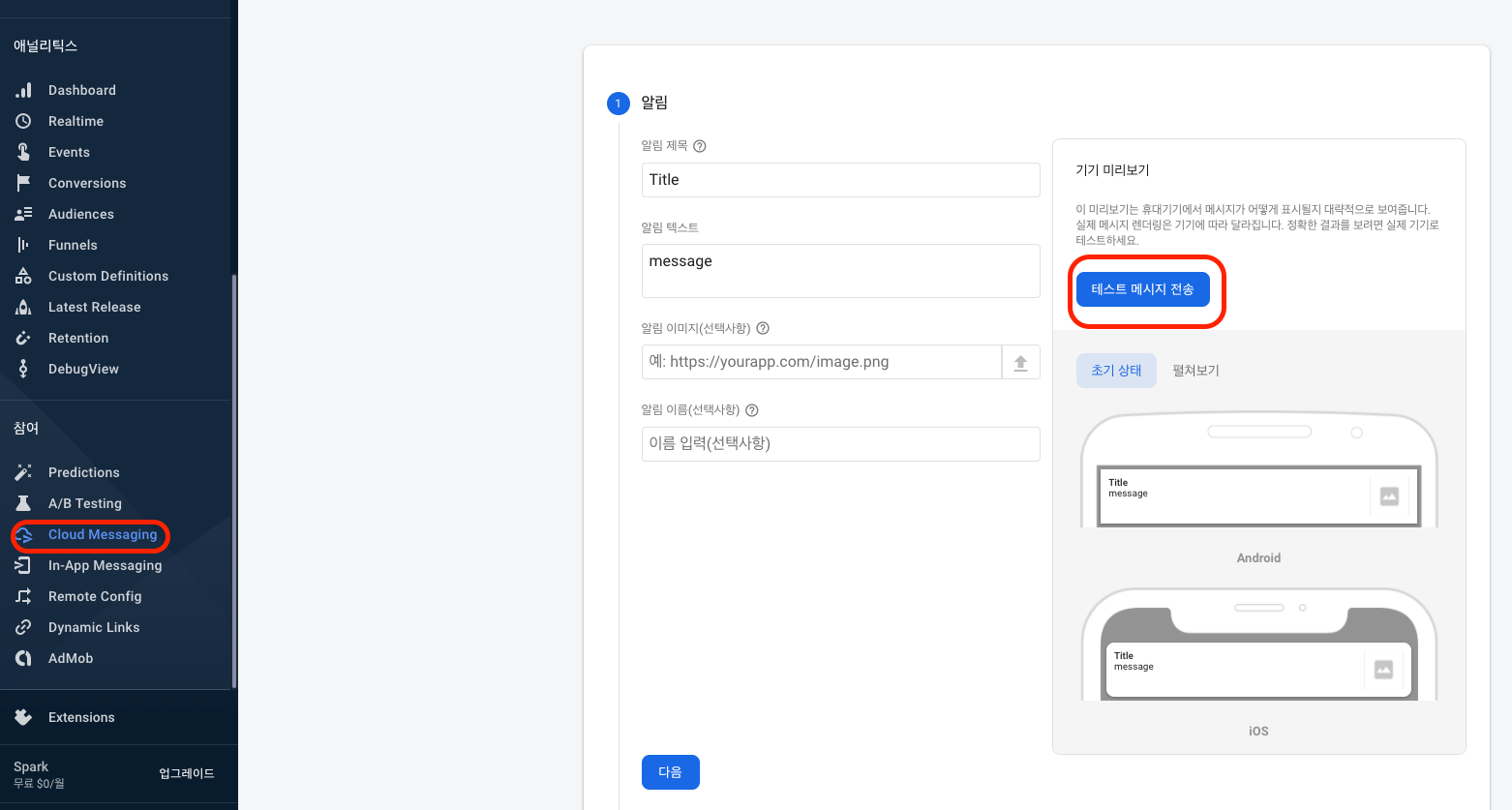 Cloud Messaging에서 `테스트 메시지 전송` 사용 방법
