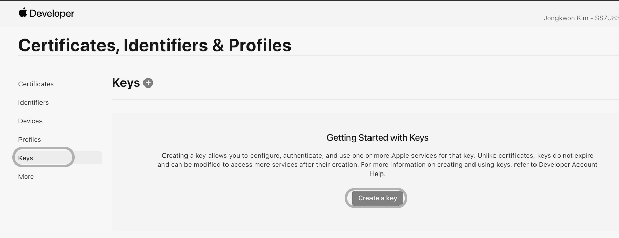 - Apple Developer > 계정 > Certificates, Identifiers & Profiles > Keys 탭