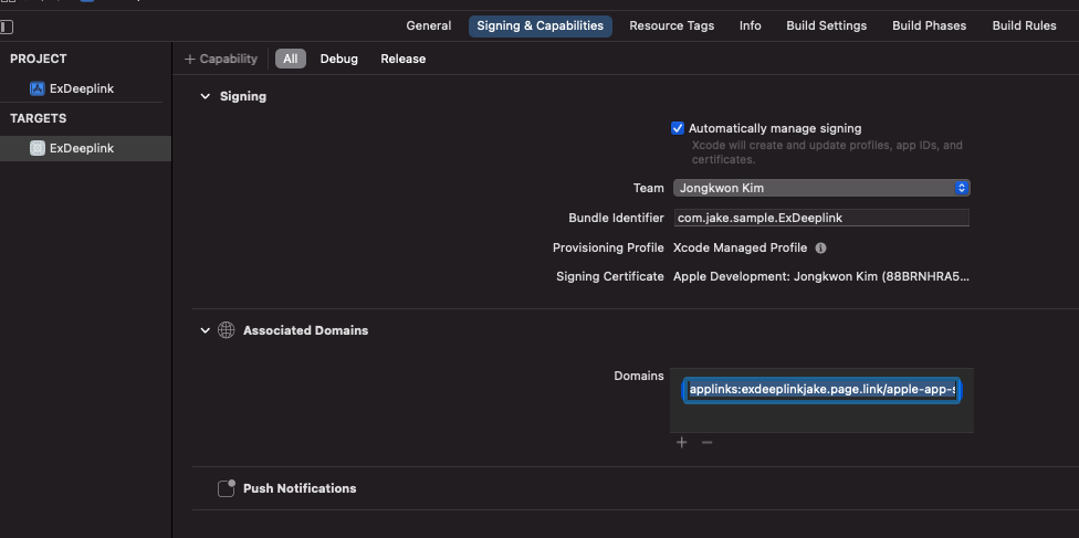 - 링크를 여는 데 사용할 앱 번들 ID를 "com.jake.sample.ExDeeplink"로 선언