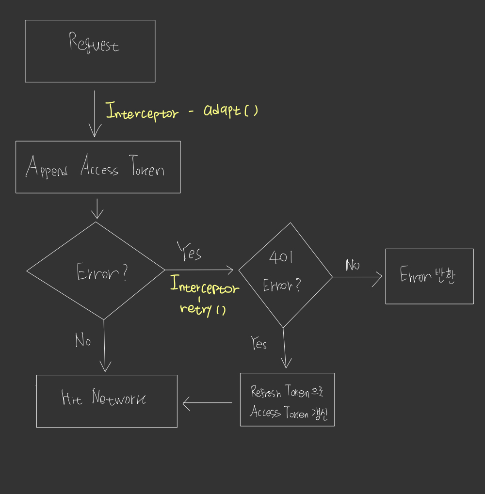 - Alamofire를 사용하면 RequestInterceptor 프로토콜을 준수한 클래스의 인스턴스를 request에 실어서 보내면 동작