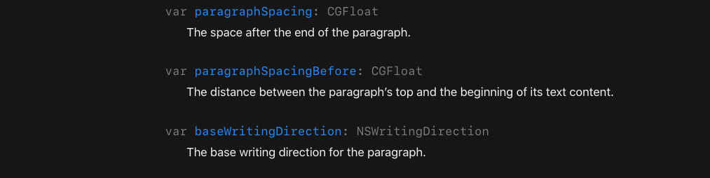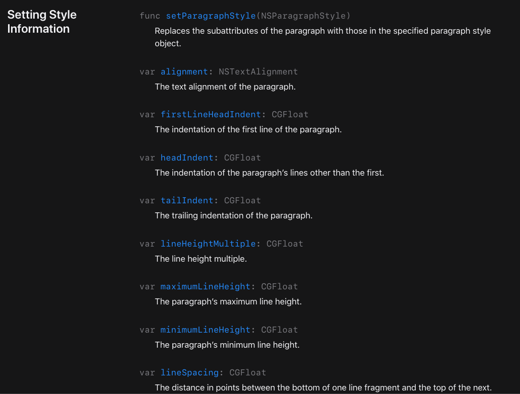 - NSMutableParagraphStyle: https://developer.apple.com/documentation/uikit/nsmutableparagraphstyle