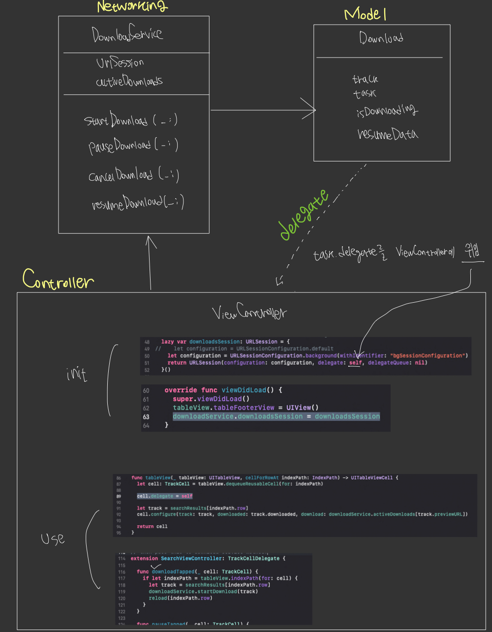 - URLSessionDownloadTask 프로퍼티가 존재, 이것의 delegate(다운로드 상황 delegate 실행)는 ViewController로 위임