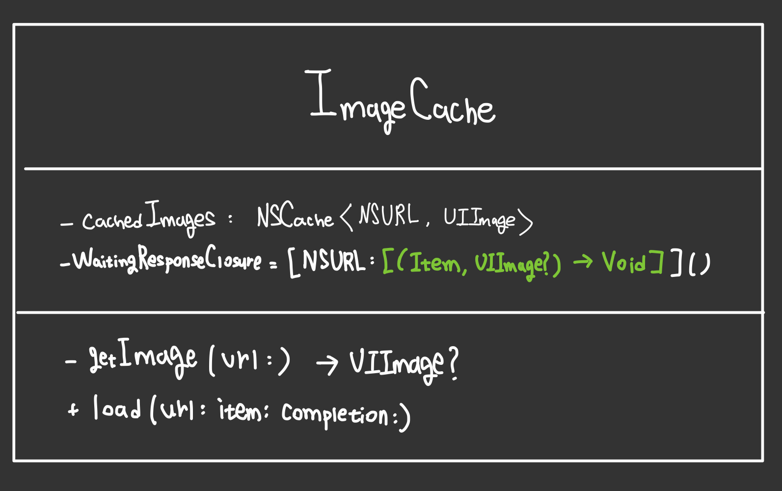 - waitingResponseClosure: cache에 image가 없는 경우, urlSession을 통해 image를 얻어와야 하므로 response를 받은 후 결과값을 전달해야 할 때, 전달받기 위해서 선언된 프로퍼티