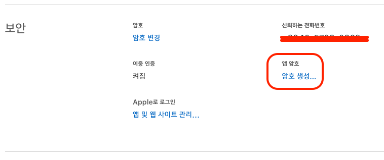 > appleid.apple.com/account/manage 사이트에서 로그인 후 암호 생성