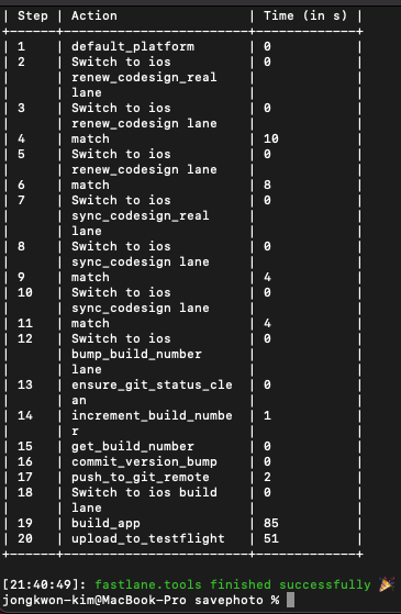 - 만약 fastlane 실행 중 build_app() 함수에서 에러가 나는 경우, xcode를 종료한 후에 아래 명령어 다시 실행하면 해결