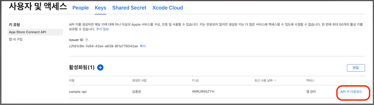 testflight에 앱 빌드를 올릴 때 사용될 2FA 인증 키 .p8파일 준비