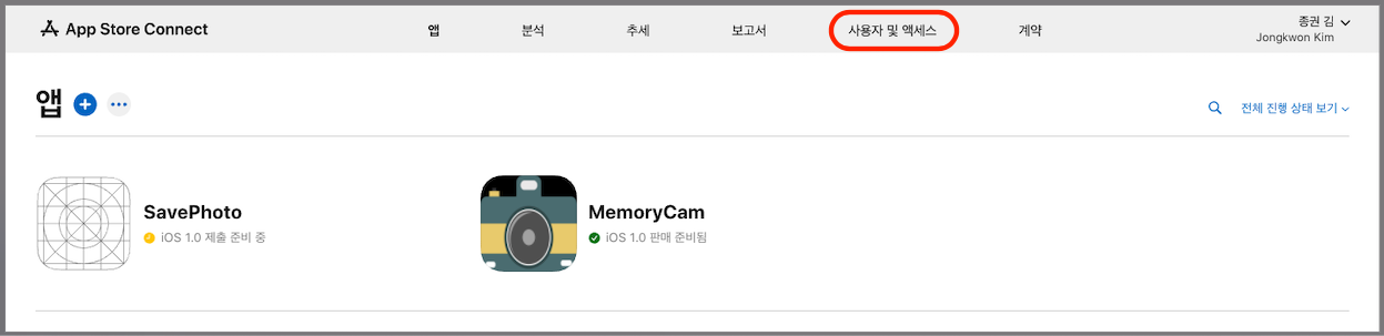 > App store connect 사이트 접속 후 `사용자 및 액세스` 탭
