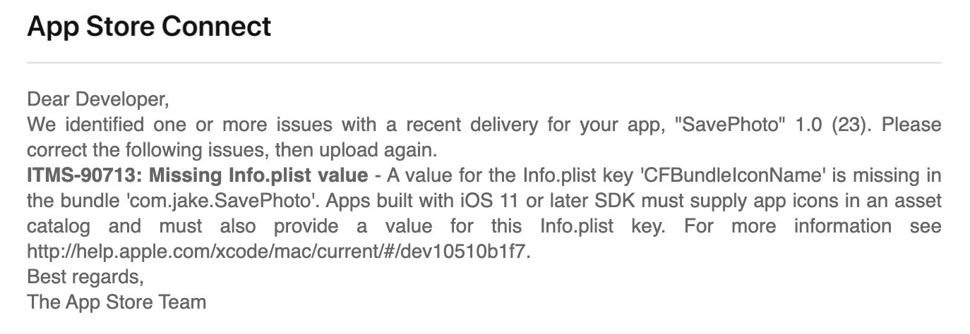 - 앱 Icon을 등록하지 않으면 build가 올라가지 않고 아래처럼 이메일을 받으므로 아이콘 등록이 필수