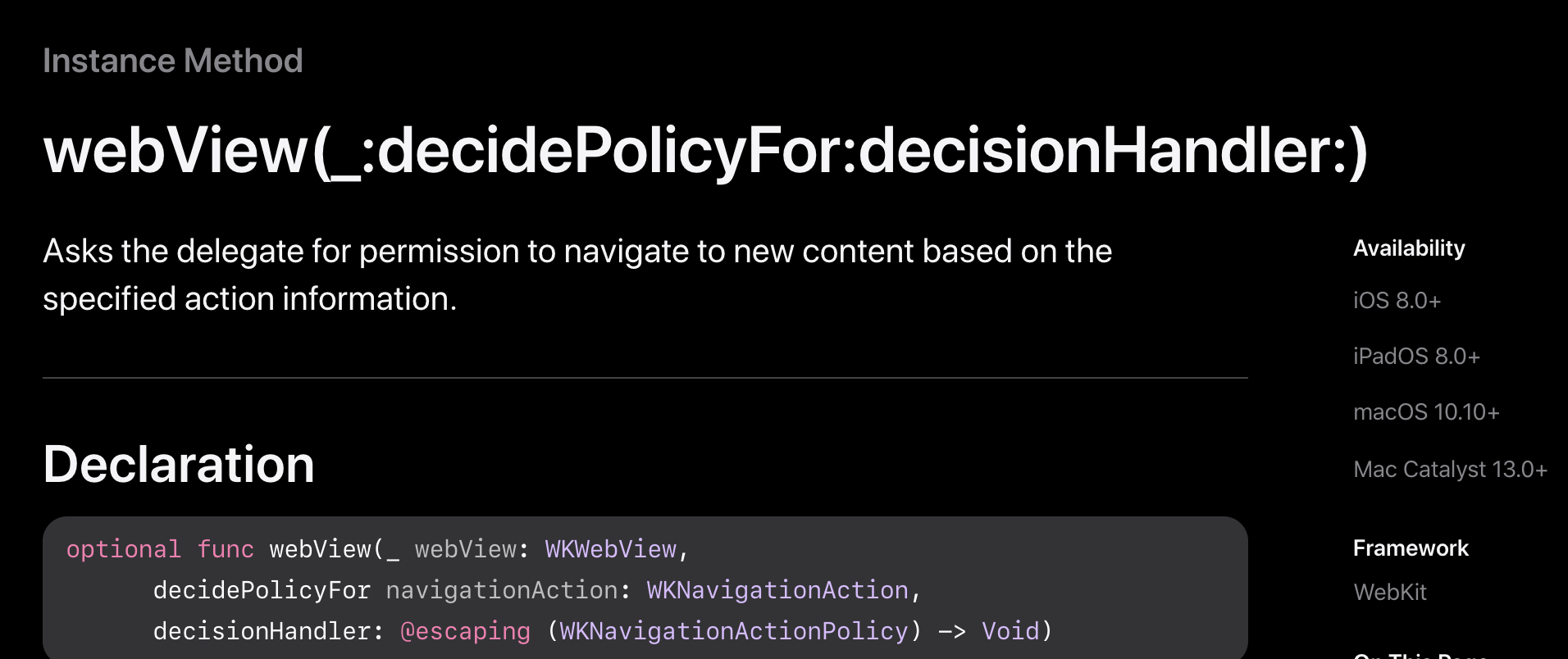 - webView(_:decidePolicyFor:decisionHandler:): https://developer.apple.com/documentation/webkit/wknavigationdelegate/1455641-webview