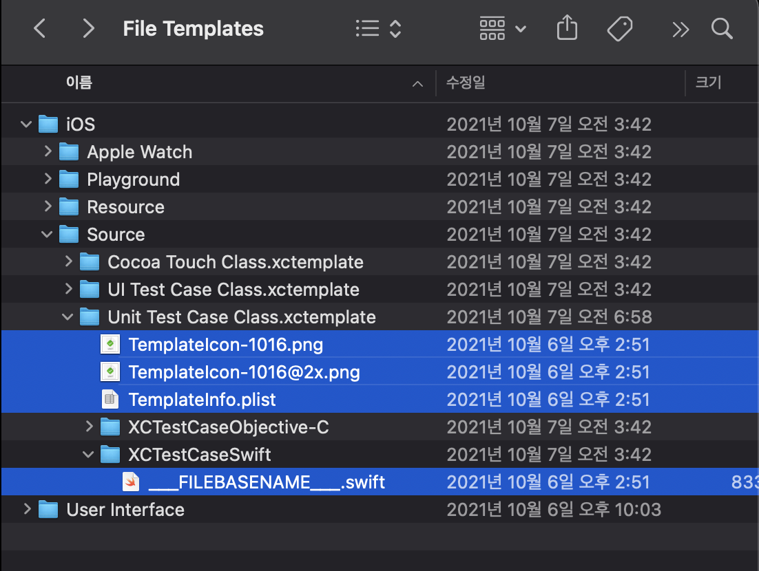 - jake.xctemplate에 필요한 파일들은, 기존것을 복사하여 수정하면 편하므로, Unit Test Case Class 템플릿 4개 파일 복사