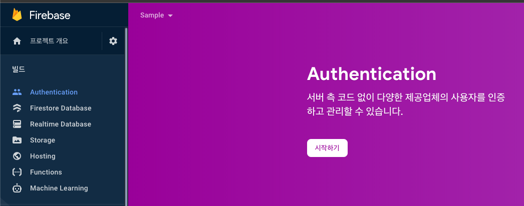 - Firebase Console > Authentication 탭 클릭 > 시작하기 버튼 클릭