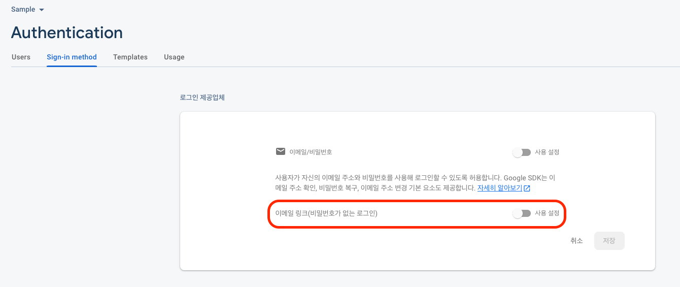 - 이메일 링크(비밀번호가 없는 로그인) 사용 설정 활성화 > 저장 클릭