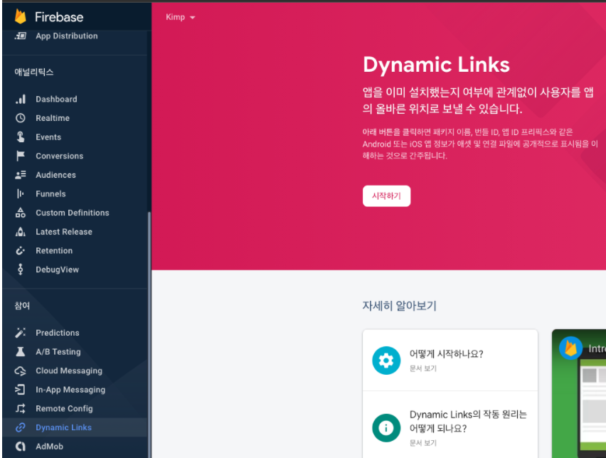 - Firebase > Dynamic Links 클릭 > 시작하기 클릭