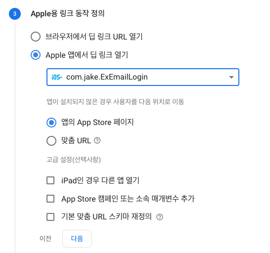 - [동적 링크 설정] 딥 링크 URL은 prefix를 "https://"로하여, 위 링크를 붙여넣기