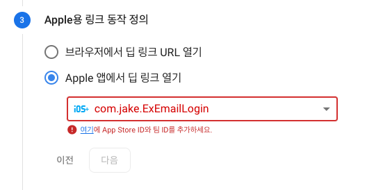 - dynamic link 생성 시 Apple ID가 필요하기 때문에 App Store Connect에서 애플리케이션 먼저 생성 필요