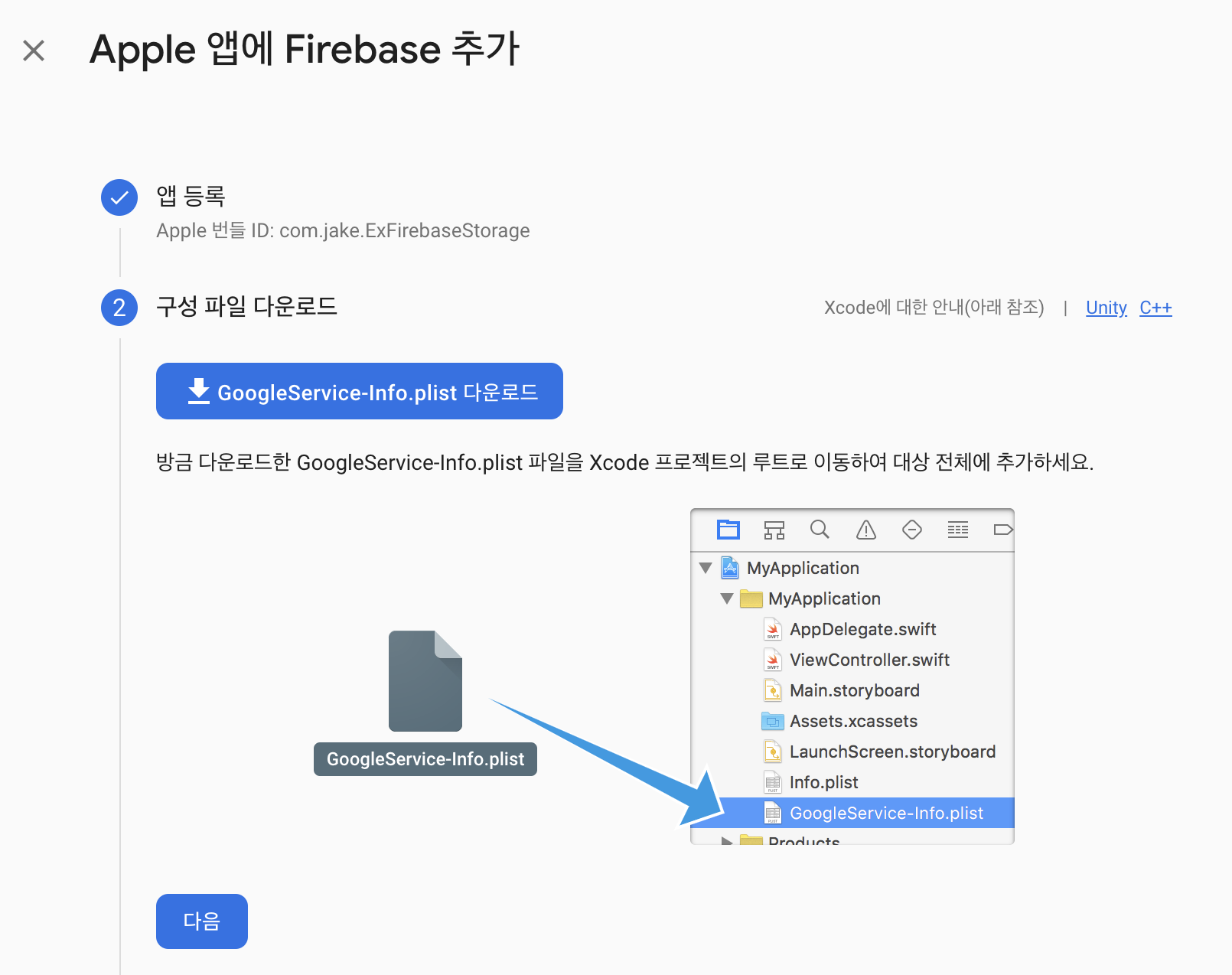 - Firebase Console에서 앱 등록 후 GoogleService-Info.plist 다운로드