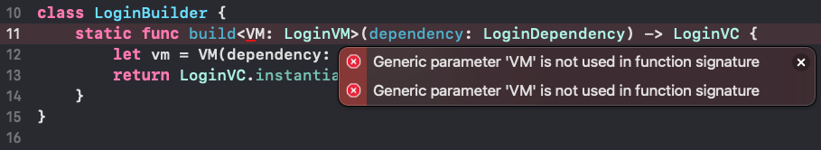 - 핵심코드: func build<VM: LoginVM>(dependency: LoginDependency, viewModelType: VM.type) -> LoginVC