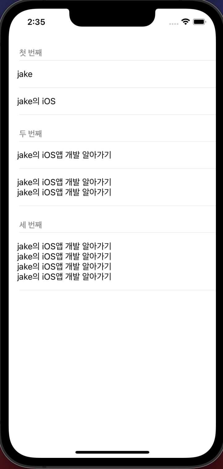 MySection(headerTitle: "세 번째", items: [MyModel(message:"jake의 iOS앱 개발 알아가기\njake의 iOS앱 개발 알아가기\njake의 iOS앱 개발 알아가기\njake의 iOS앱 개발 알아가기")])