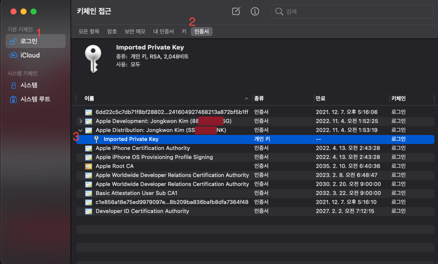 - .cer 파일을 두번 클릭하여 활성화 -> Keychain Access 앱 -> 인증서 탭에 활성화된 것 확인