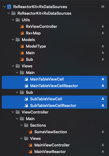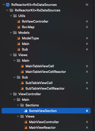 // SomeViewSection.swift import RxDataSources enum SomeViewSection { case first([SomeViewSectionItem]) } enum SomeViewSectionItem { case main(MainTableViewCellReactor) case sub(SubTableViewCellReactor) }
