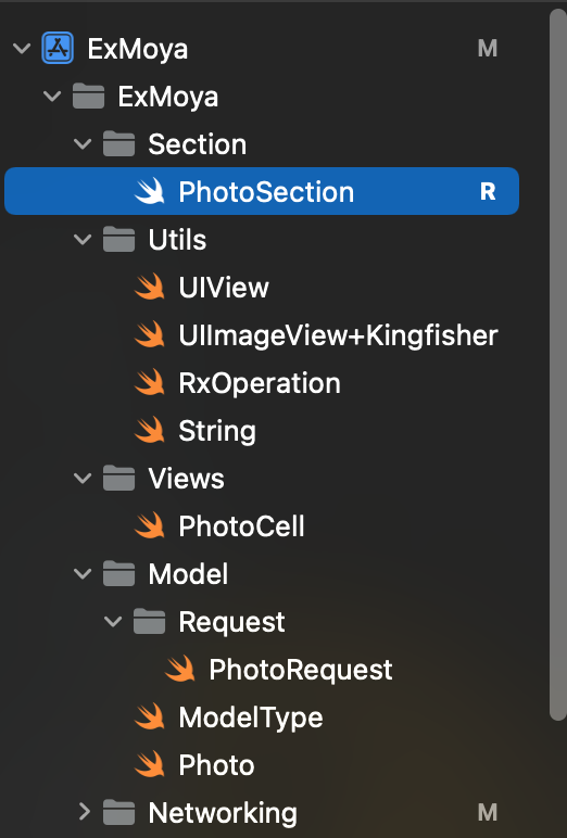 // viewDidLoad() 에서 호출 private func setupCollectionViewDataSource() { let collectionViewDataSource = RxCollectionViewSectionedReloadDataSource<PhotoSection> { _, collectionView, indexPath, sectionItem in Self.collectionViewConfigureCell( collectionView: collectionView, indexPath: indexPath, item: sectionItem ) } self.photoDataSource .bind(to: self.collectionView.rx.items(dataSource: collectionViewDataSource)) .disposed(by: disposeBag) } // MARK: DataSources private static func collectionViewConfigureCell( collectionView: UICollectionView, indexPath: IndexPath, item: PhotoSectionItem ) -> UICollectionViewCell { switch item { case let .result(photo): let cell = collectionView.dequeueReusableCell(for: indexPath) as PhotoCell cell.setImage(photo: photo) return cell } } - Moya를 사용한 Networking 요청